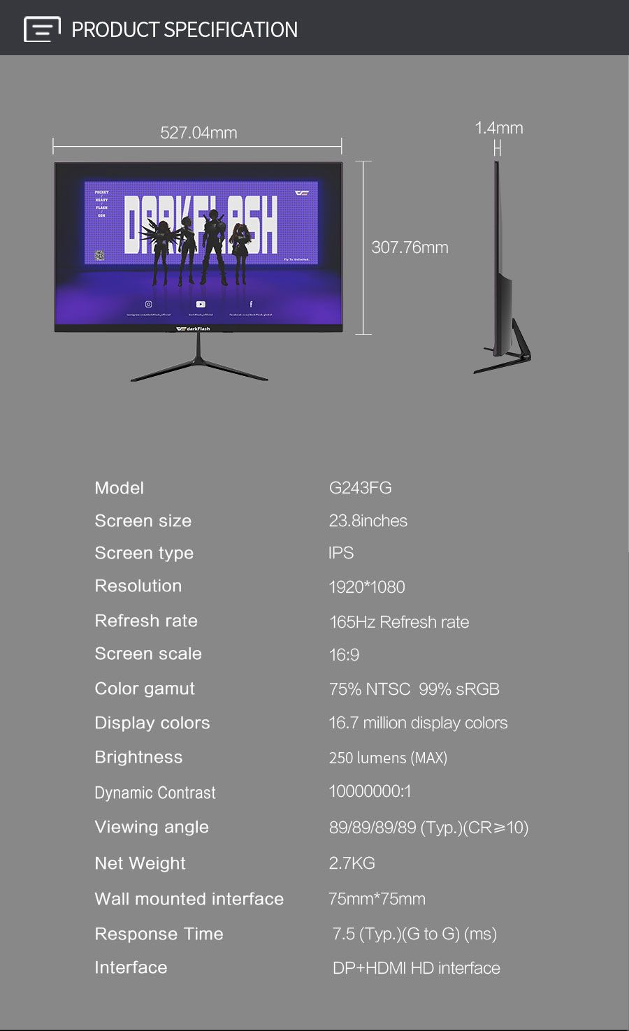 DarkFlash G243FG 23.8 inch 165Hz IPS Full HD Gaming Monitor 1ms DP HDMI With Official Warrenty